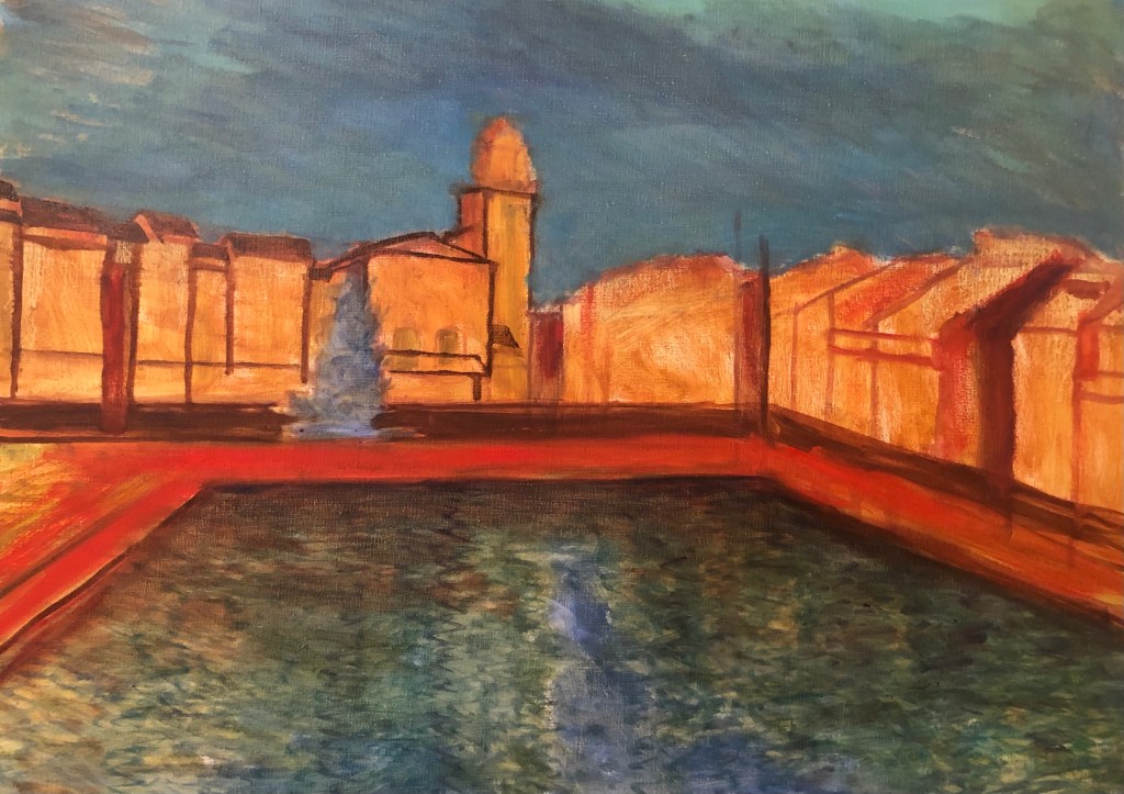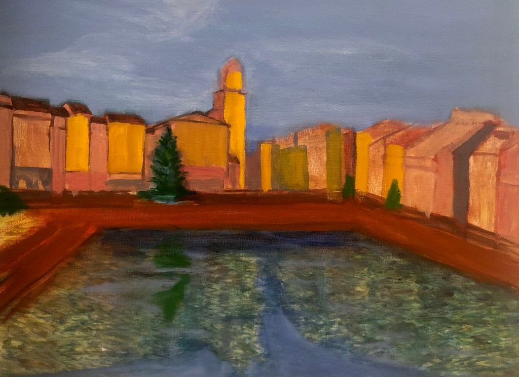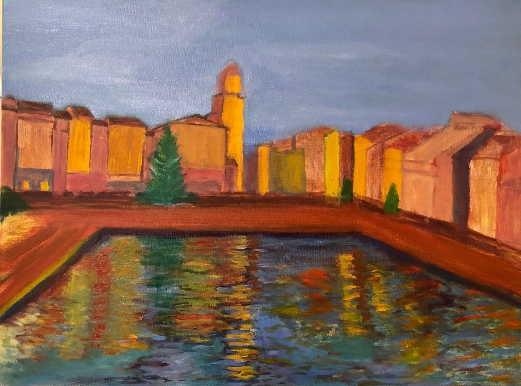 Overall it took 18 months to execute! Thats due to a number of factors; including my interest in the image, a struggle with perspective, value changes, building placement, and contrast in detail between the buildings and reflecting pool. The truth is it was a huge struggle. I dont think I have ever had so much trouble with a painting.