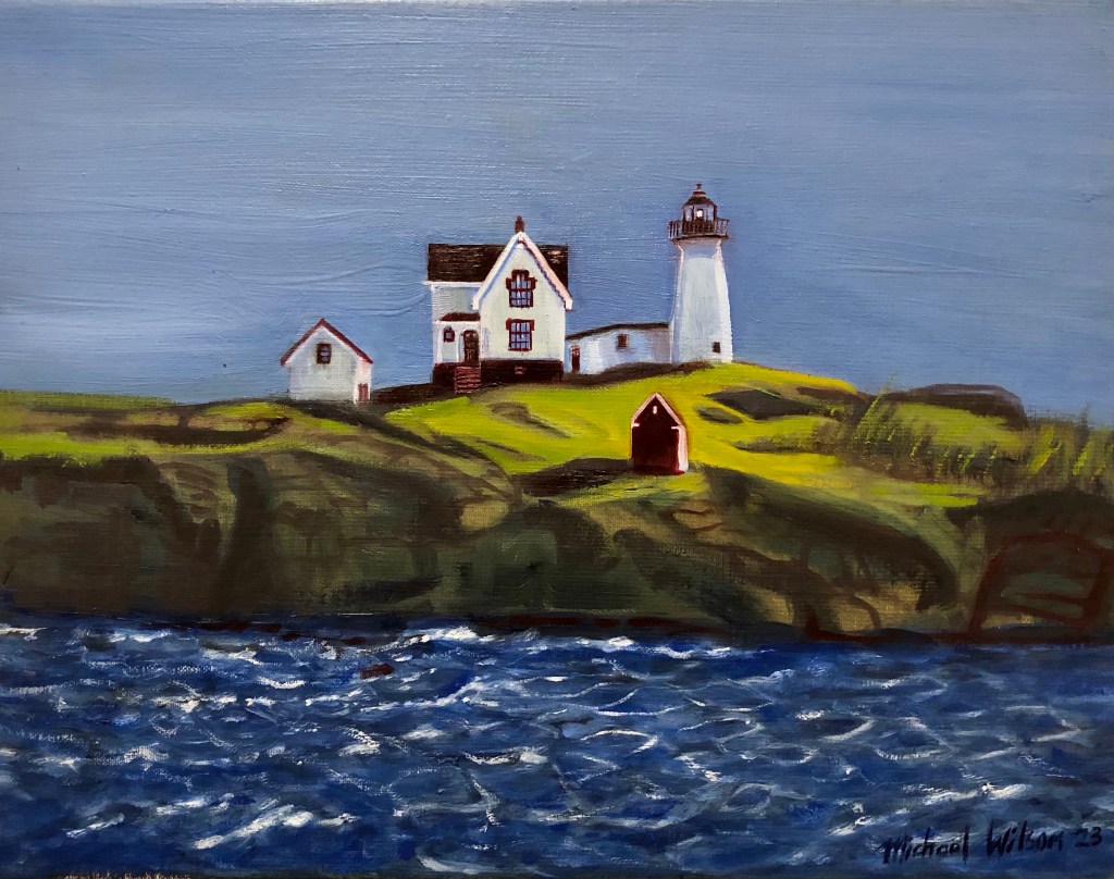 We have visited Nubble Light, Cape Neddick and Ogunquit, Maine many times. Last fall I took several photos during a perfect sunny afternoon and decided to paint the lighthouse. If you haven’t visited it the lighthouse is on a small rocky island and is not accessible except by boat. I chose to eliminate the fence and a second smaller out building to simplify the composition.
