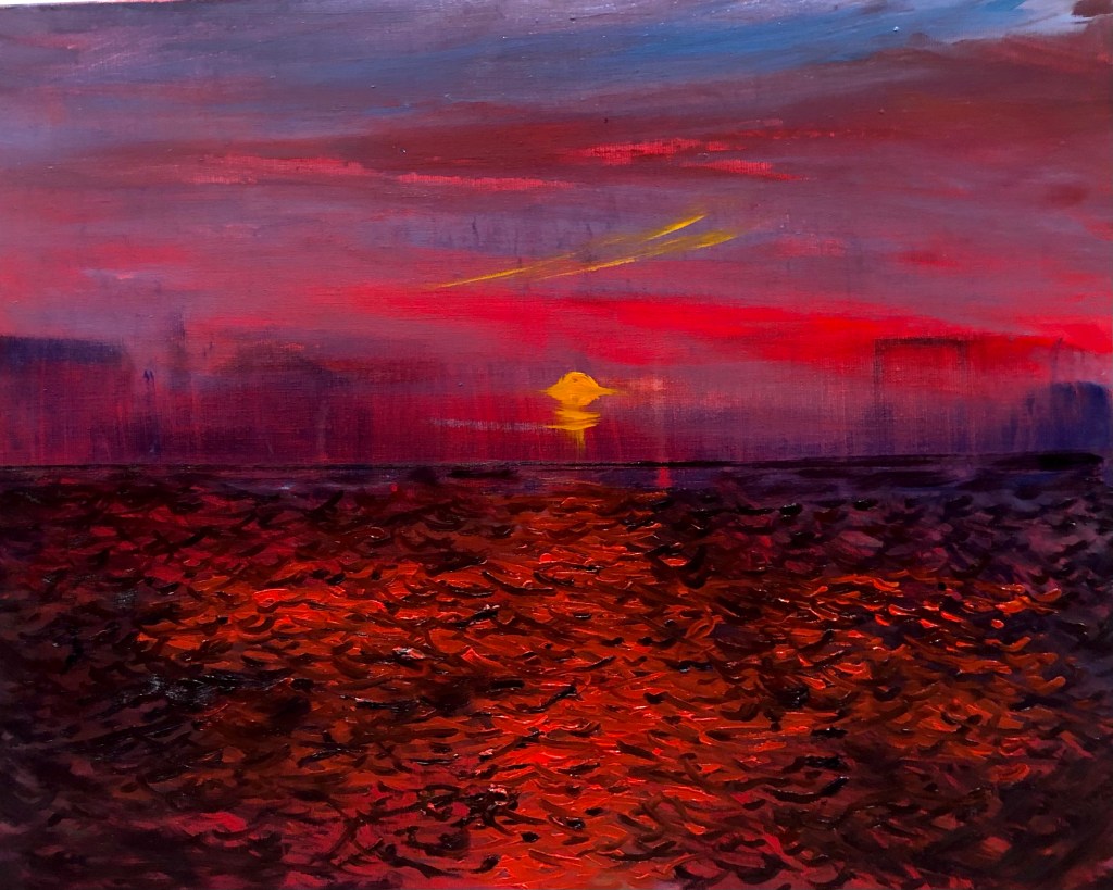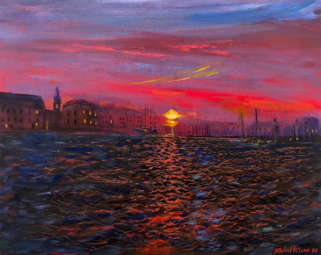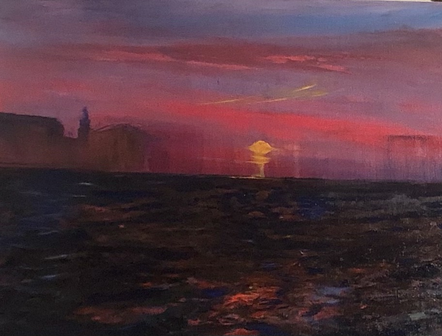 The inspiration for this painting came from a few photos I’ve taken in Camden Maine and Nantucket. Its a compilation of a twilight harbor scene with intense light red and deep blues just before sunset. I made a number of changes during the painting process before settling on the final. I set it aside or viewed it from the easel and then came back to it several times.