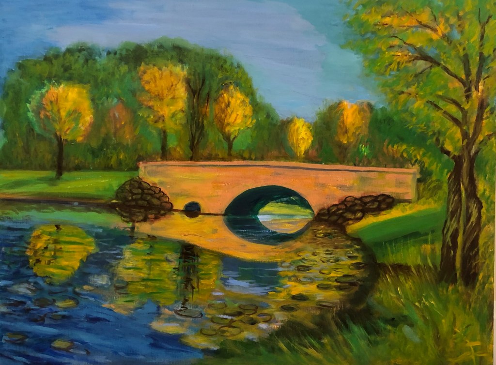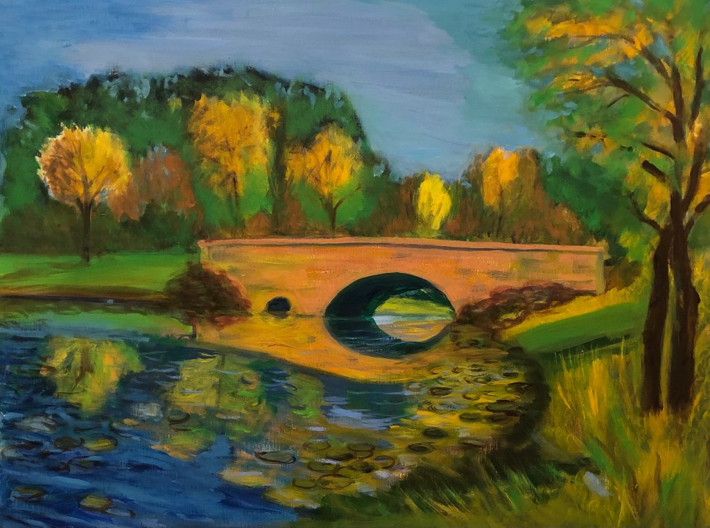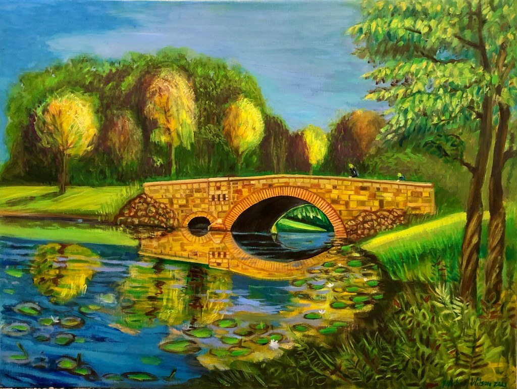 There is a magnificent stone bridge in Lincoln, Massachusetts that was built in 1912. Its in part of the Sudbury River surrounded by wetlands and farm fields. There is a walking path in the conservation area nearby. I have painted this bridge before but wanted to make another painting and add a couple of hikers on the road.