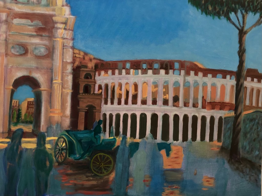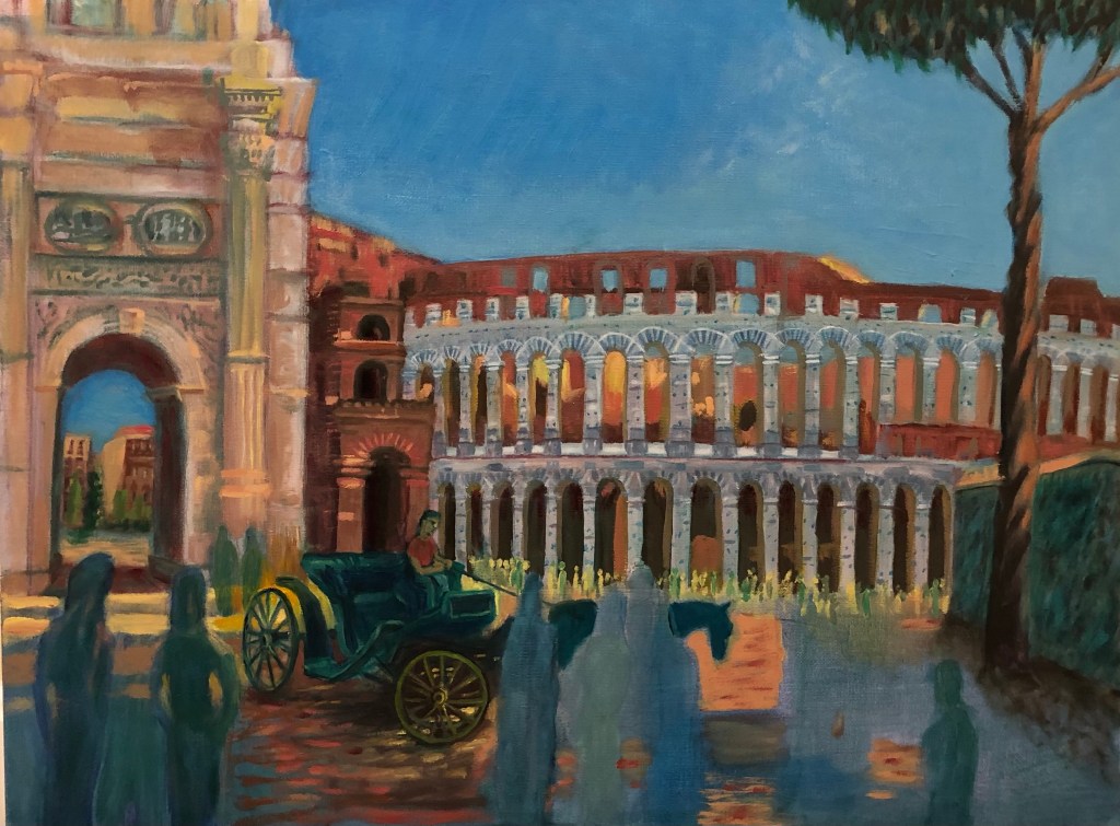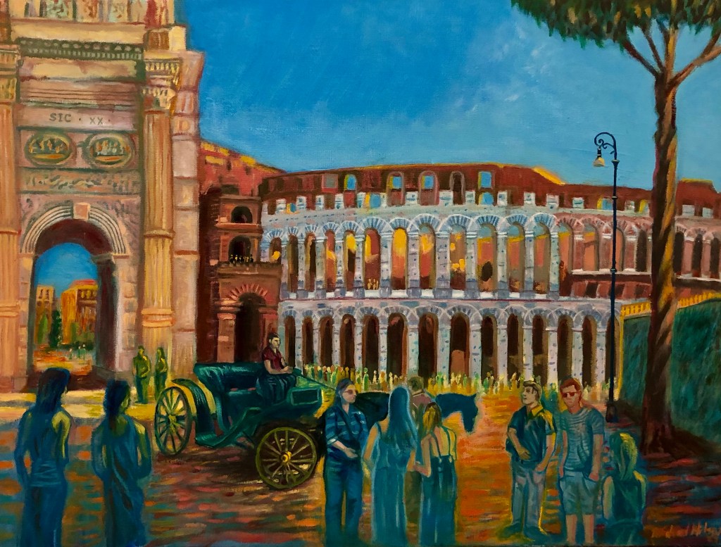 This painting depicts the Colosseum and a small portion of the Arch of Constantine. It was a hot summer day when we visited in July 2018. There were crowds and plenty of tourists waiting in line. The light and shadows cast across the Colosseum were amazing. I streched the arches to emphasize its height and made the colonade more compact because it was a truly massive structure. I used a refence photo I took but changed positions of people and scale to make the image familar yet unique. Many colors used and several sittings to finish it. Oh by the way, for a little fun I added myself to the painting. See if you can guess which figure is me.