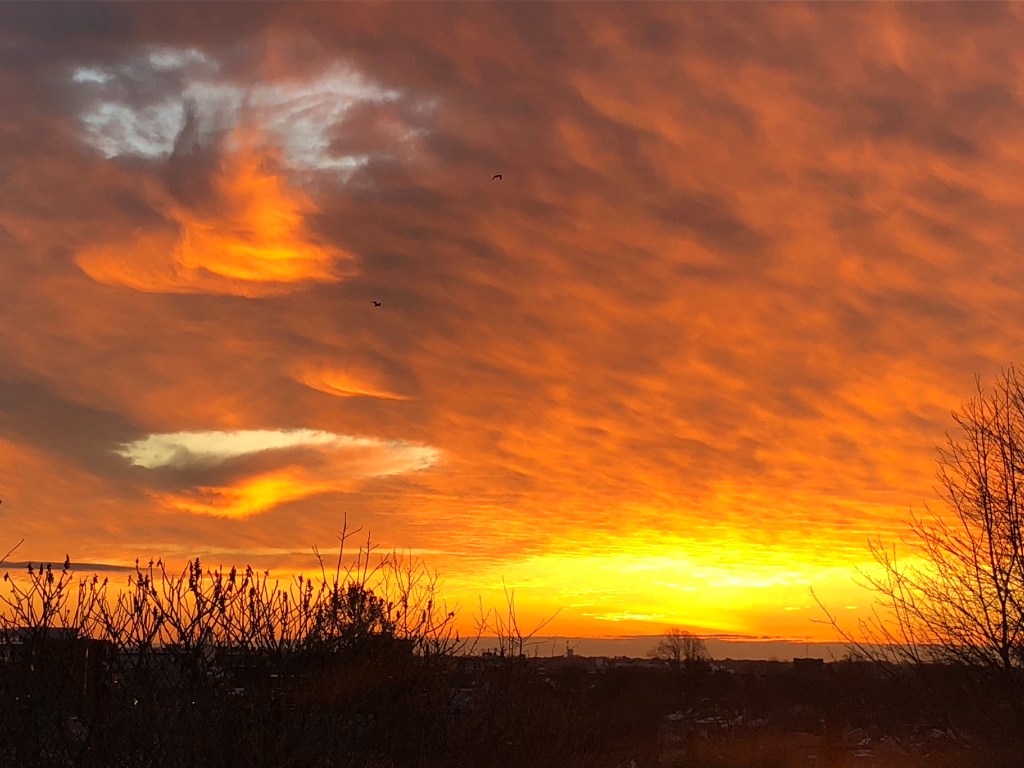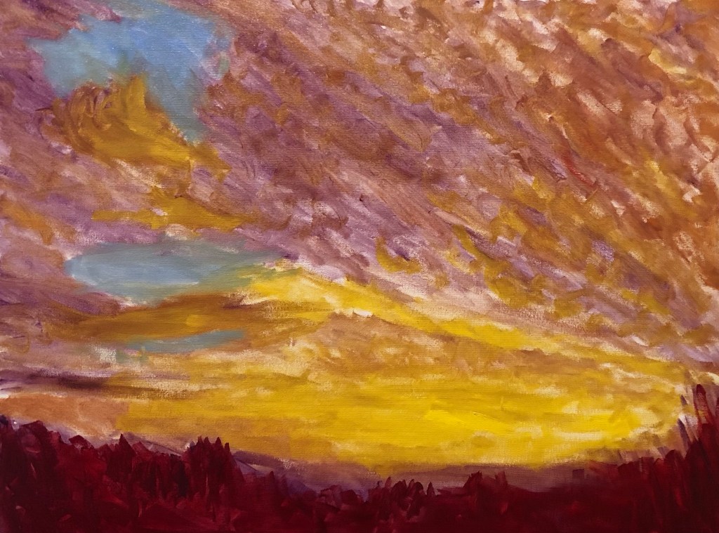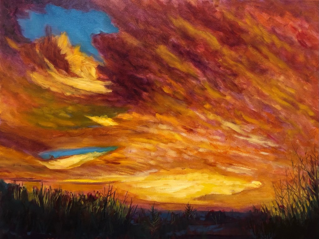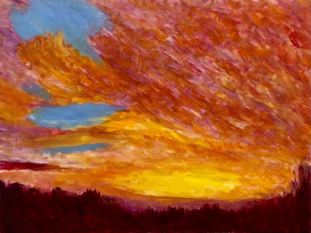 Capturing an awesome sunrise with the intense colors and shadows in the early morning can be breathtaking. This sunrise was remarkable. I took many photos and spent twenty minutes or longer just watching the light as the sun rose on a frigid cold January 23, 2024. The view is from a park on top of a hill looking across Peabody and Salem Massachusetts towards the harbor. There were so many hues of intense reds, magentas, oranges and yellows and two small clear blue openings. The two blue opening were in sharp contrast with the backlighting and reflections on the clouds. It was spectacular and very memorable. The truth is I painted the first three stages without a reference photograph and only used the reference photo in the last stage.