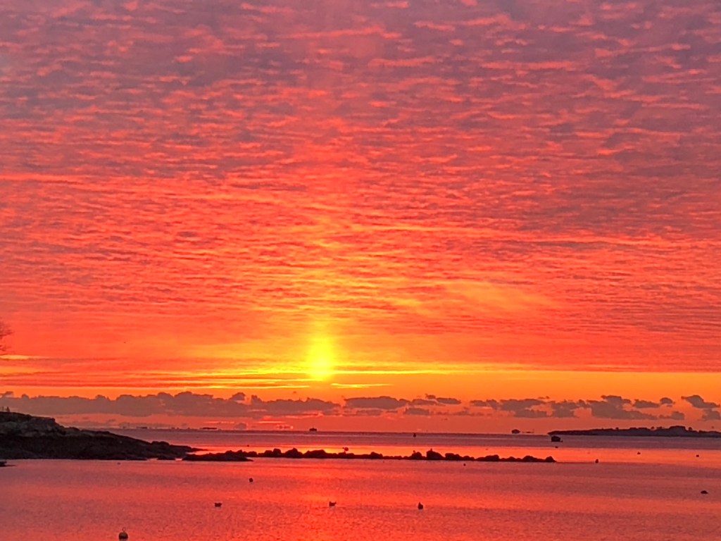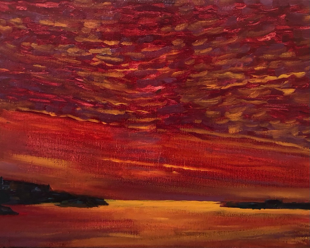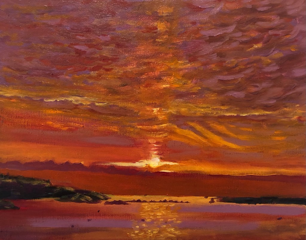 This painting is from a photograph I took at sunrise looking towards Marblehead. There was great light with violets, reds, oranges and yellows. The reflection off the water and clouds was phenomenal.