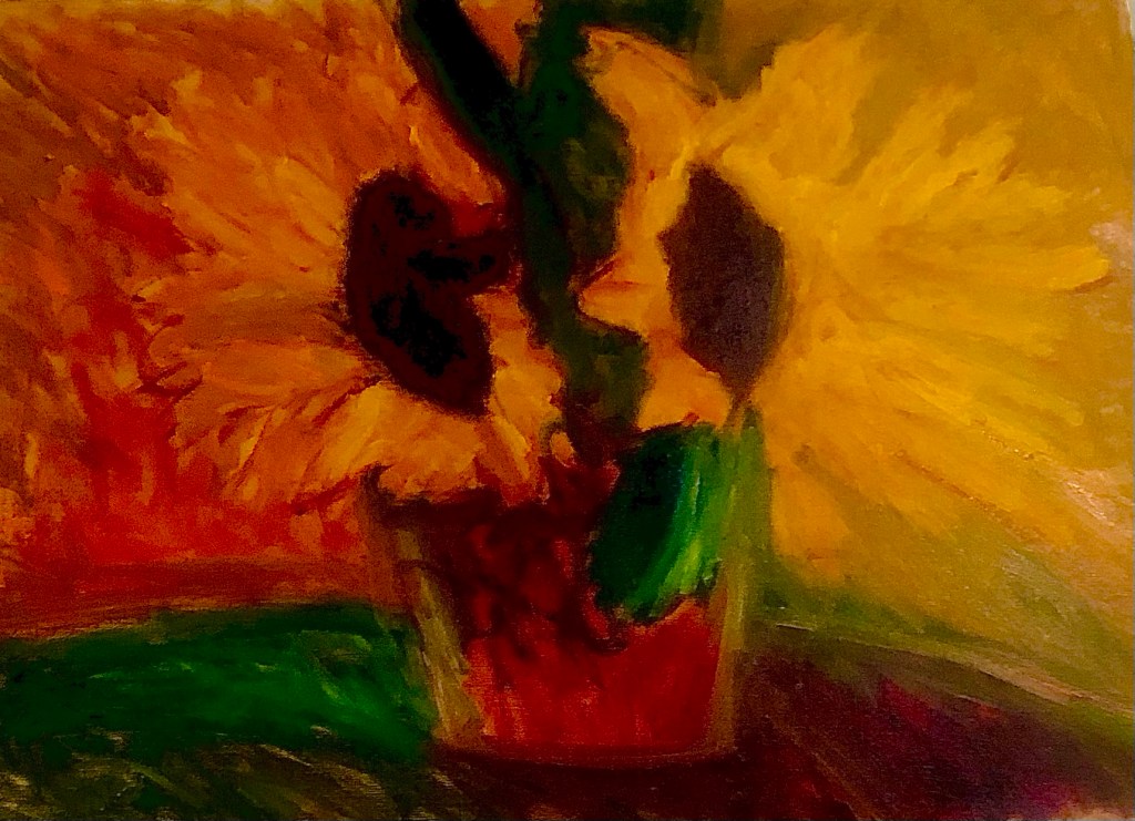 I wanted to paint an interpretion that was mine. I have to admit it was fun to paint this little still life even though I broke the cardinal rule and centered it on the canvas and even dared to “mirror” it. This is my only painting of just sunflowers as the center of interest. It will have to do for now.