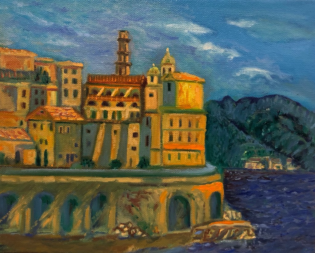 MC Escher made a lithograph of Atrani in 1931. My painting is a view from a lower angle than his print and is not an accurate representation of the town.