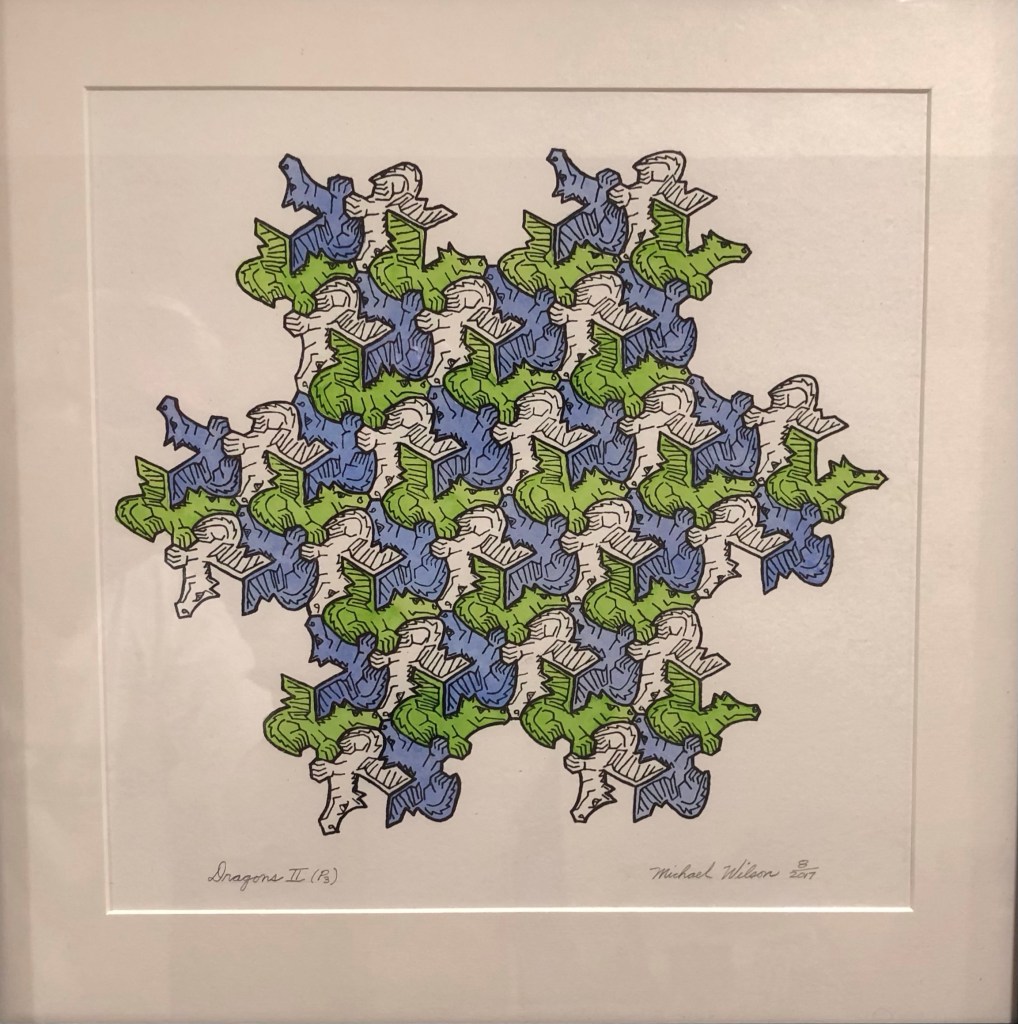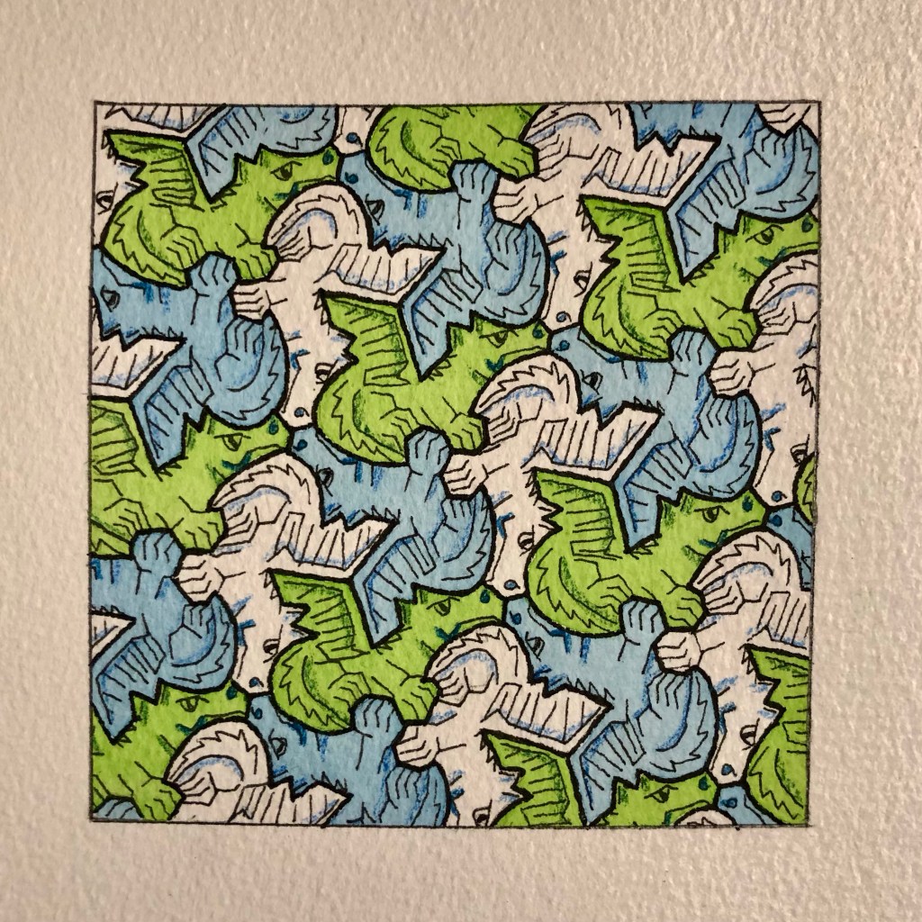 This is a small watercolor and color pencil of a dragon tessellation that rotates 120 degrees with three copies of itself to tile the plane. The original was a lithograph with watercolor only (no color pencil) that I had completed several years ago in a “star” pattern on a larger scale. I will post the new one from March 2026 and the original from 2017.