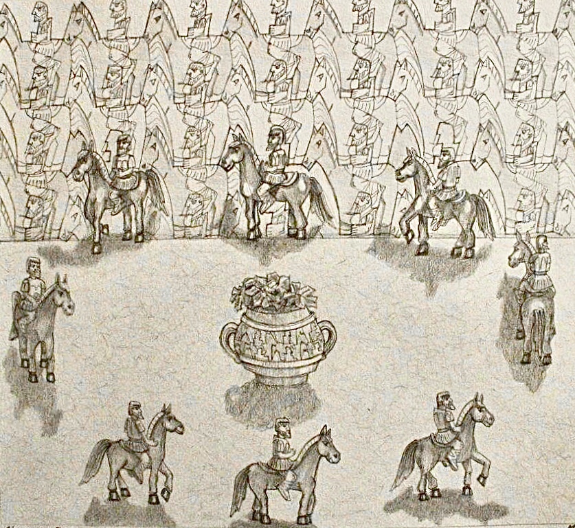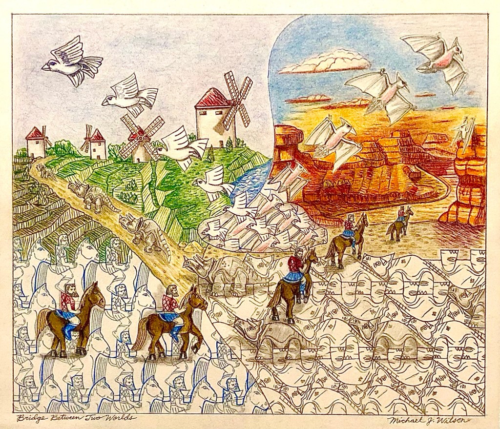 Those of you that are interested in tessellations may appreciate this post, however if you like my oil paintings you may not be impressed and not appreciate it. Let me explain the title first. This drawing is an intersection of three (3) different tiling groups ( of the 17 standard tiling groups, not counting aperiodic tessellations) that surround a porthole or time bridge. The horsemen (P1 group), the triceratops(P2 group) and the pterodactyl and bird(Pm group). These are the most common symmetries used by Escher in his tessellations. The intersection porthole or time bridge has the birds emerging and flying right to left while the pterodactyls emerge flying to the right. The horsemen travel from left to right into the page and the triceratops wander from right to left. I purposely left several horsemen and triceratops in outline form to make the drawing easier to understand. It would have been to complex with all of the motifs fully colored and this also sllows the progression to be followed.