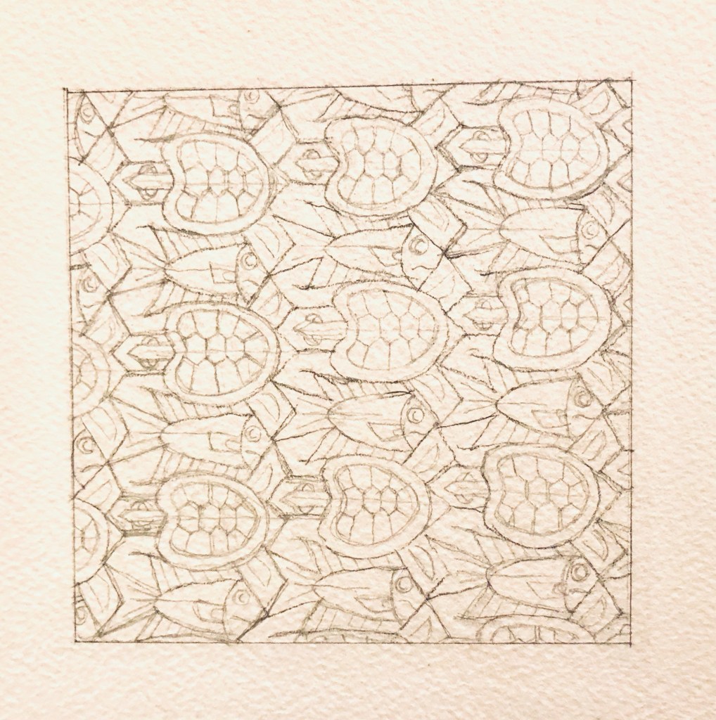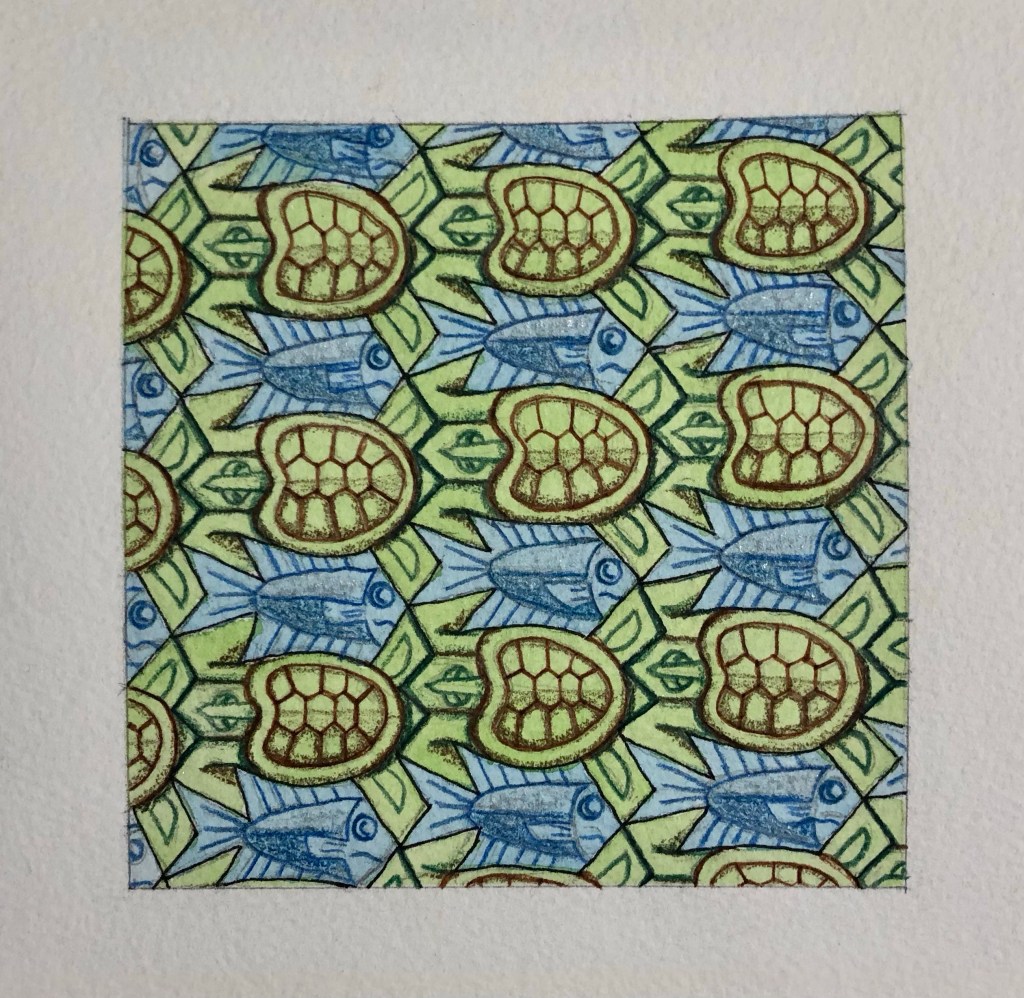 This is a watercolor and color pencil tessellation of sea turtles and fish. The tessellation came from a linocut print that I made several years ago called “Bermuda”. It was inspired by my time in Key West. When I was diving I used to see green sea turtles and have caught dolphin while fishing. The fish motif is a stylized version of a dolphin since the tessellation doesn’t have a rounded head like the dolphin. I added some silver color pencil over the blue to try to show They have beautiful color and are iridescent when the sunlight shines off their sides while they swim.