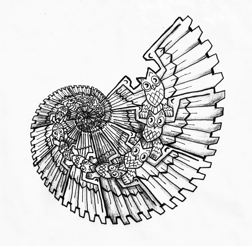 Spiral life-like tessellations are not that common due to the inability to easily stack slices and make an image that is recognizable. This is a single spiral of an owl motif I had originally created as a double spiral. I chose the single spiral for this image to simplify it and allow the viewer to easily see the progression. I used black and white to make the slices discernable and a little more graphic.